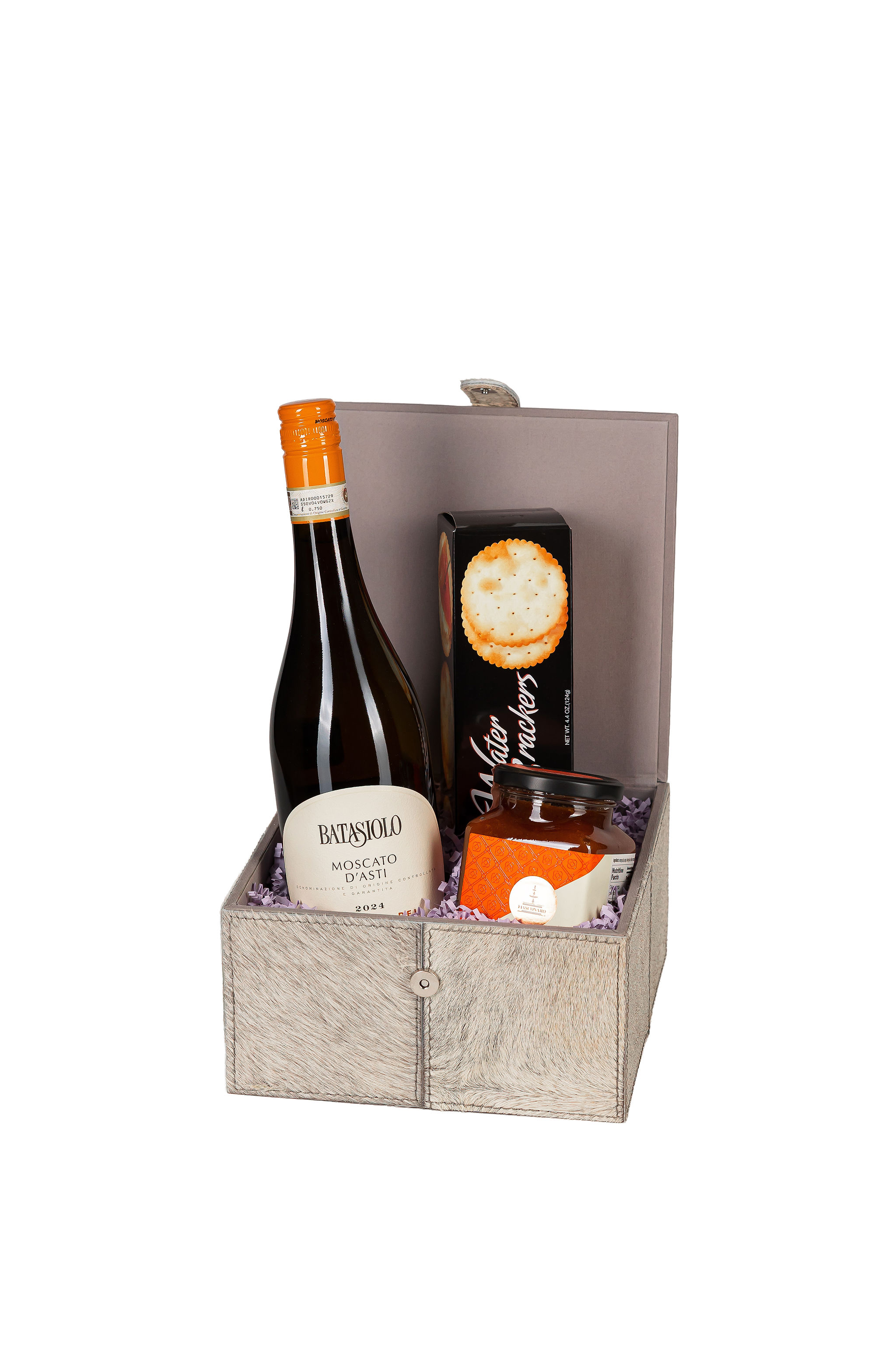 Baúl en piel con vino italiano Batasiolo Moscato y conservas