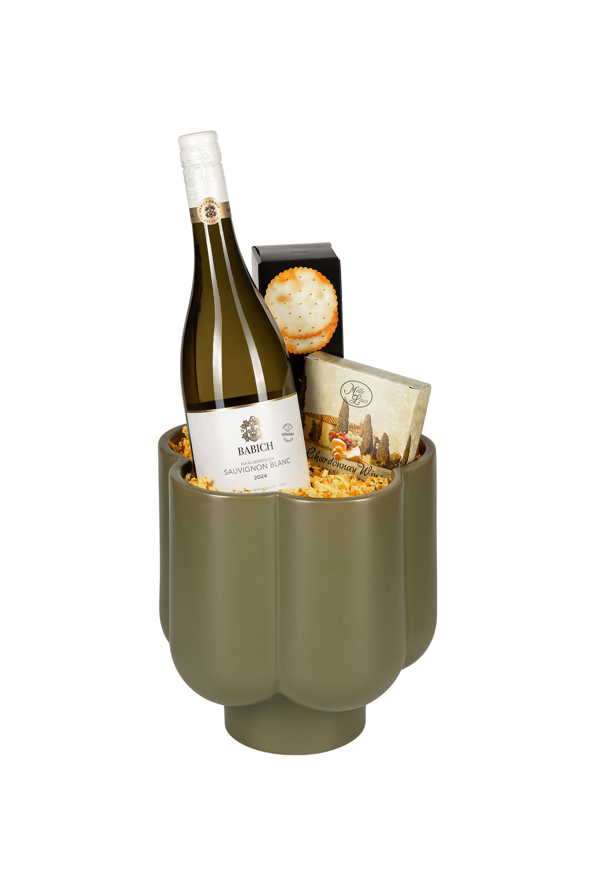 Elegante base en cerámica con vino Babich Malborough Sauvignon Blanc y conservas