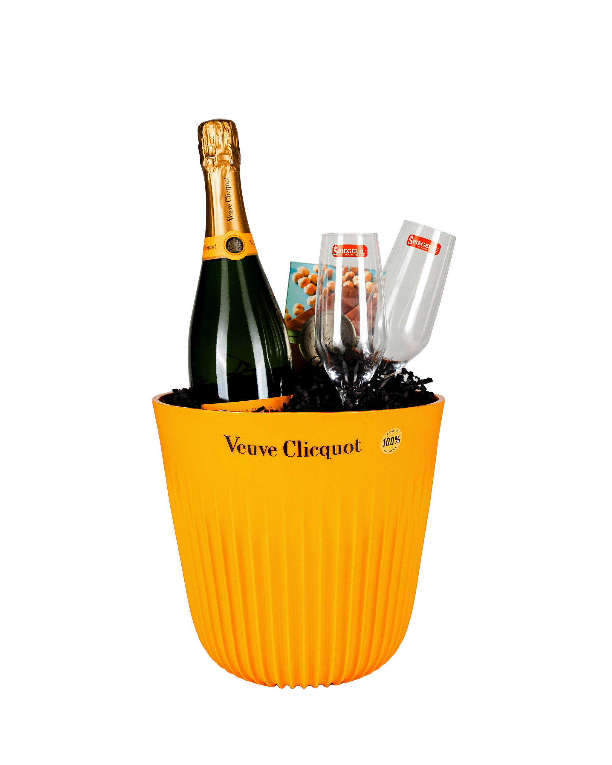 Hielera de VCP con champagne Veuve Clicquot Brut, Copas Spiegelau y conserva