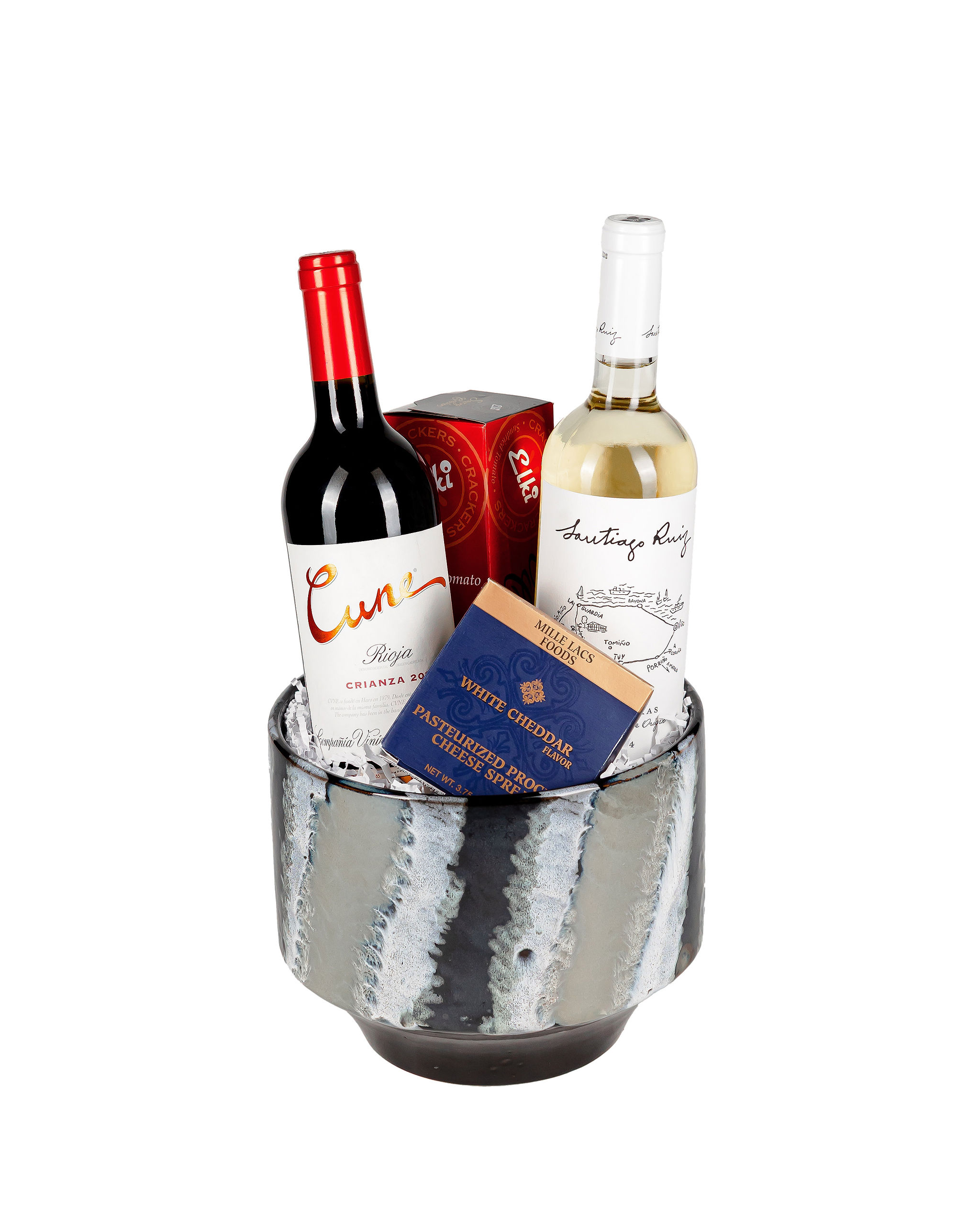 Linda base negra con vinos españoles Cune Crianza, Santiago Ruiz y conservas