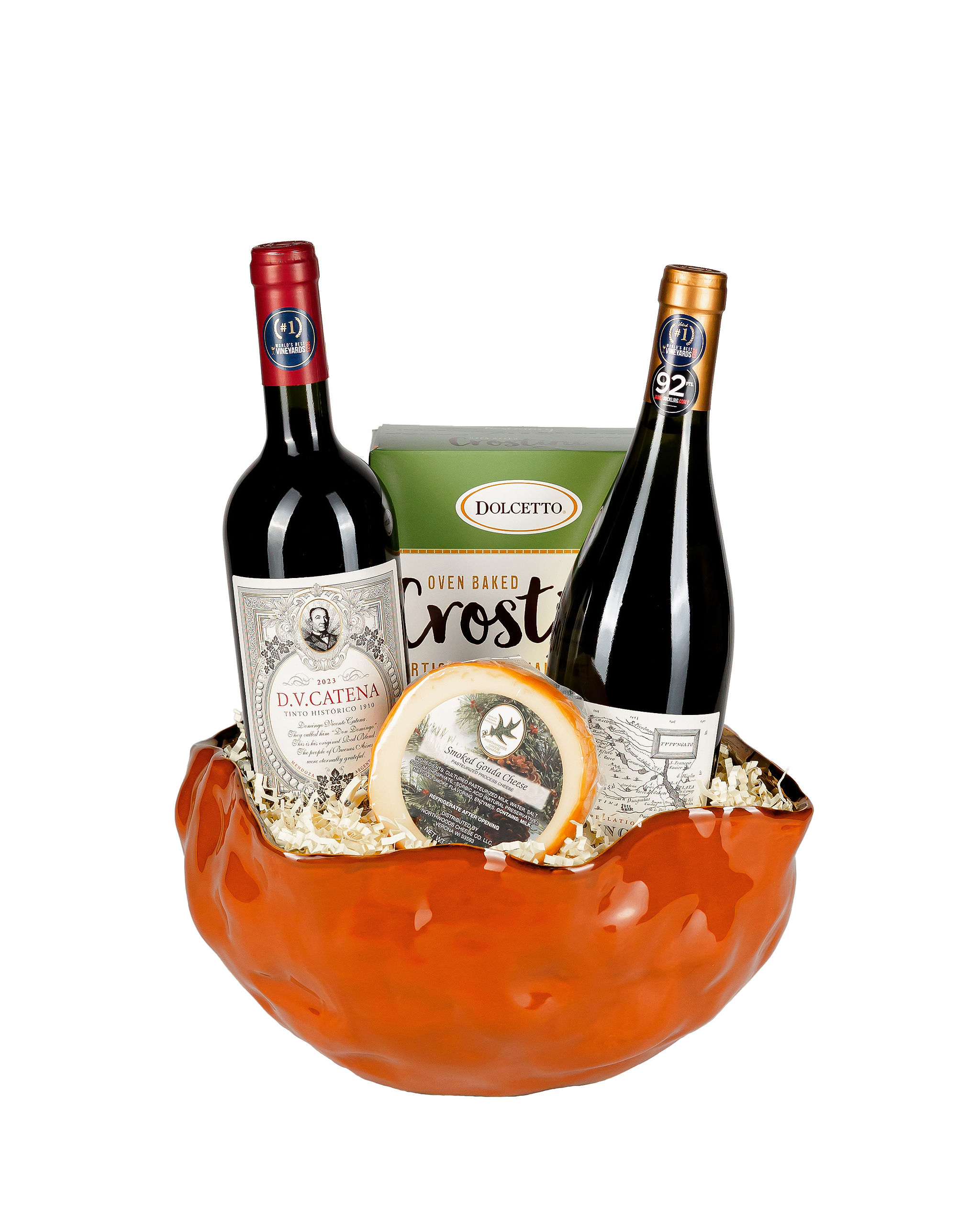 Curiosa base en cerámica con vinos argentinos Catena DV Red Blend, Catena Tupungato Chardonnay y conservas