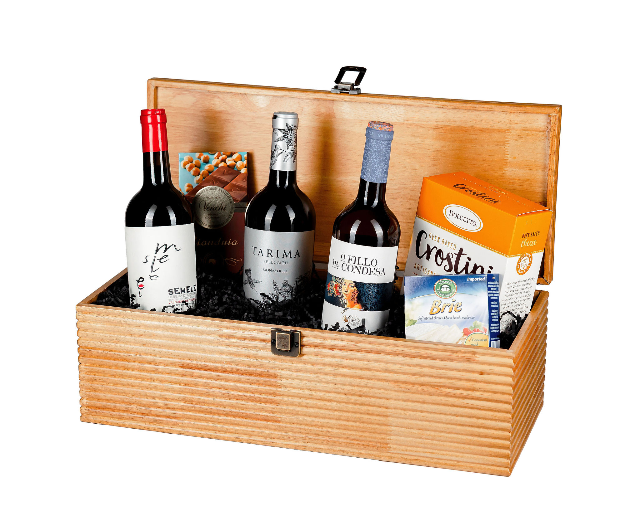 Baúl en madera con vinos españoles Semele, O Fillo Da Condesa, Tarima y conserva